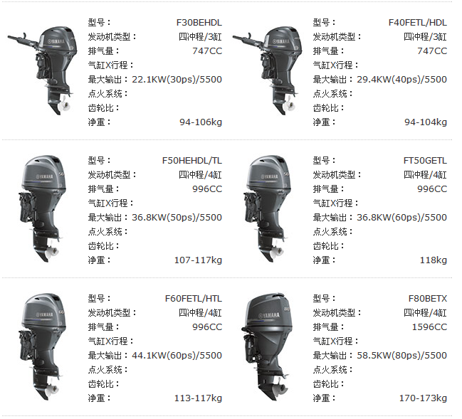 四沖程船外機(jī)系列,具有***的燃料經(jīng)濟(jì)性和清潔排放特性。對(duì)于30PS和更高指標(biāo)的船外機(jī),配有高性能電子燃油噴射,可使性能達(dá)到更高水平。在很多型號(hào)中由于雅馬哈的先進(jìn)技術(shù),還實(shí)現(xiàn)了更高的性能,更輕的質(zhì)量和緊湊式的設(shè)計(jì),可與兩沖程媲美。